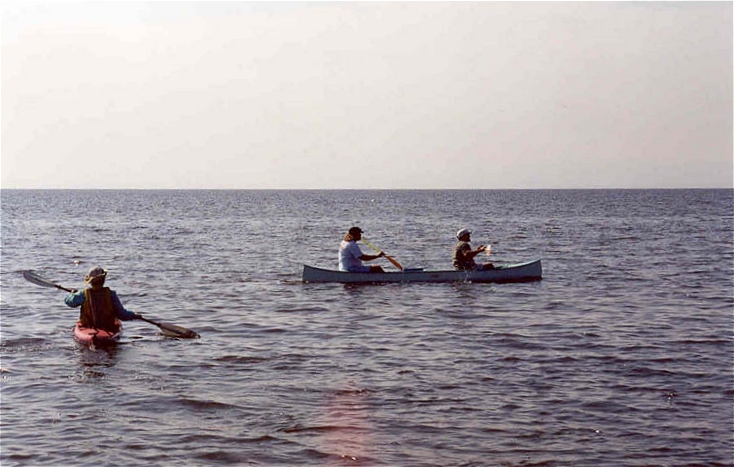 We paddle furiously as wave after wave hits us broadside. I'm not in any real danger as I'm only about 200 feet from the shore, but, with the pounding waves, it would be almost impossible to get going again should I capsize. I'm a little unnerved, but I'm more worried about Jerry and Steve. They are in an open canoe and it is taking in water with each wave. My kayak, its cockpit covered with a spray skirt, is able to handle waves much better than their canoe. Plus, it takes a fair amount of coordination between the two paddlers to keep the canoe going straight. And they had not paddled at all for months. After what seemed like an eternity but was really only an hour, they pull over and I follow. We had covered barely a mile but we were tired. We rest a little and resume paddling. Luckily, the wind and waves soon abate and we pull into Corvina Estates (map point 2) at 2:30 P.M. to the cheers and relief of Joy, De and a few other well wishers.